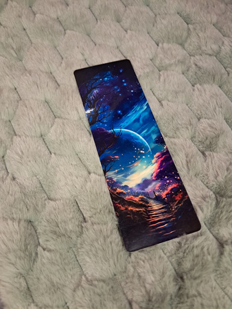 Ta jednostronna zakładka do książki zachwyca niezwykłym połączeniem kosmicznego nieba i malowniczej, oświetlonej ścieżki prowadzącej przez kolorowy krajobraz. Intensywne barwy błękitu, fioletu i różu tworzą magiczną atmosferę, która pobudza wyobraźnię i idealnie pasuje do książek fantasy, science fiction oraz opowieści pełnych przygód.